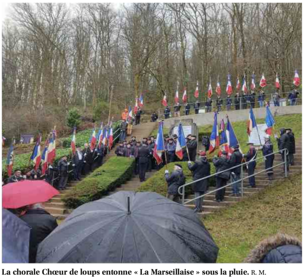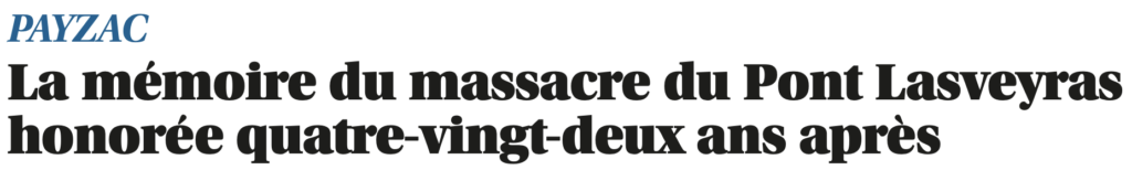 Devant une Auvézère qui déborde, les différents groupes de portedrapeaux ont pris place autour de la stèle des Maquis. De nombreuses personnalités ont fait le déplacement : sénateurs et préfets de la Dordogne et de la Corrèze, de nombreux maires et même la consule générale d’Allemagne. « Des hommes coupables de rien ont payé le prix de la haine », chante la chorale Chœur de loups. Le président de l’association Moulin de la Résistance et de la mémoire du Pont Lasveyras, Francis Comby, a pris la parole pour relater les faits, mais surtout pour « ne pas oublier », particulièrement en ce moment où « la guerre est aux portes de l’Europe ».
