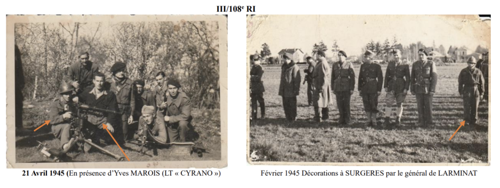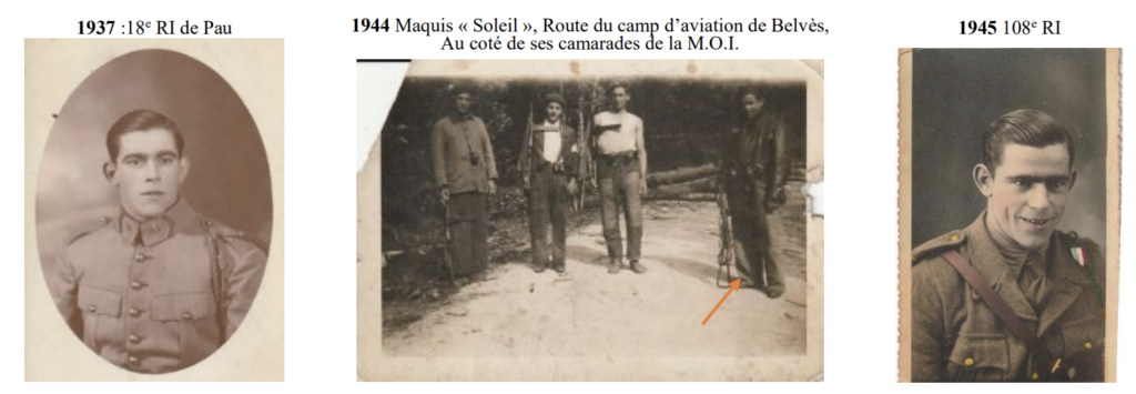 2 Dès le premier jour de sa captivité il n’a qu’un seul but : s’évader, ce qu’il fait en novembre 1942 mais il est repris à FONTOY, en MOSELLE et ramené au point de départ, au stalag « IV G » commando 115 ». Il s’évade à nouveau le 11 avril 1943, évasion qui, cette fois, est couronnée de succès. Il arrive à LA REOLE (après avoir franchi la ligne de démarcation dans un wagon SNCF rempli de cageots vides) où il prend le train pour TOULOUSE, se présente à la gendarmerie qui lui conseille de se rendre au centre de démobilisation de MONTAUBAN, où le 10 mai 1943, il est démobilisé et rayé des contrôles de l’armée active, à compter du 11 avril 1943. Le 12 mai 1943 il arrive à BELVES où séjourne une partie de sa famille et il se camoufle chez monsieur BARJOU au « Colombier » sur la commune de SAGELAT. Le 21 février 1944 il rejoint la Résistance et rentre au groupe « Soleil » qui était en train de se constituer avec René COUSTELLIER qui venait se ravitailler dans une ferme (les Fargues), chez MALAURIE, située à moins d’un kilomètre du Colombier à vol d’oiseau. Après avoir effectué un stage à l’école des cadres dans le secteur de CARSAC dans le Lot, il est nommé adjudant le 30 avril 1944.il est affecté au groupe franc N° 4, (5e bataillon), où il participe à toutes les actions marquantes du « 4 e régiment FTPF ». Le 20 octobre 1944, sur le front de la ROCHELLE, il se distingue une fois de plus lors d’un accrochage de sa patrouille avec une section ennemie près de VERINES, ce qui lui vaut sa deuxième citation avec une nouvelle étoile de bronze à sa croix de guerre.