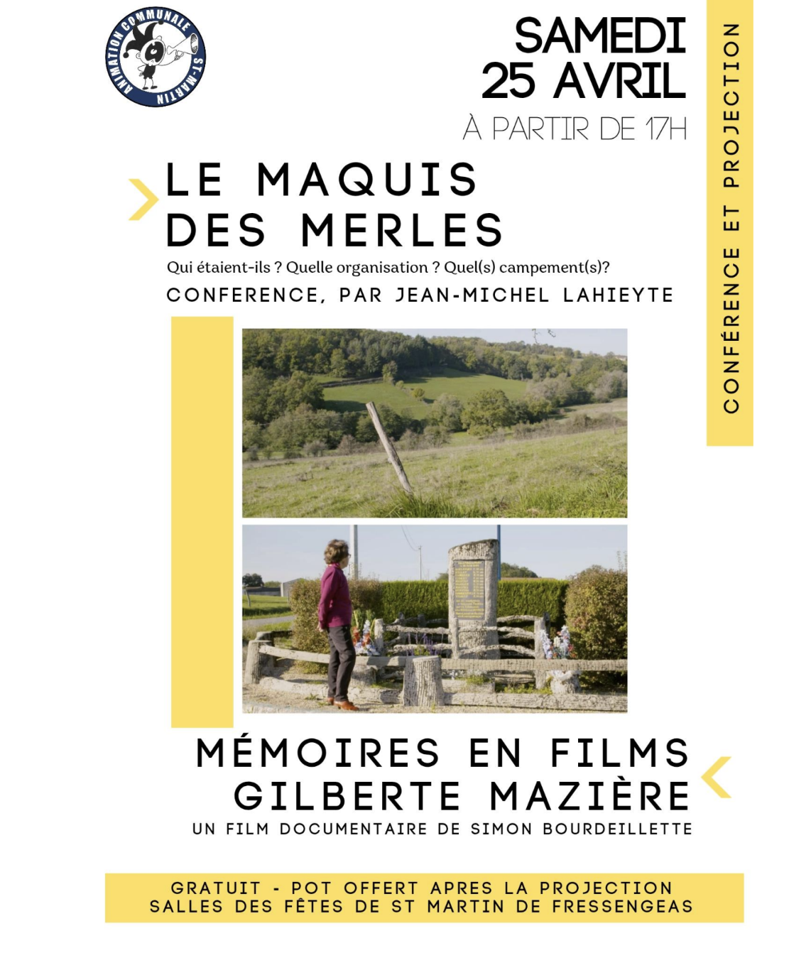 Le maquis des Merles : conférence de Jean-Michel Lahieyte et projection du documentaire « Mémoires en films – Gilberte Mazière ». Samedi 26 avril 2026 – 17h – Salle des fêtes de Saint Martin de Fressengeas -Entrée libre ( Mairie de St Martin de Fressengeas et Comité local ANACR de Thiviers )